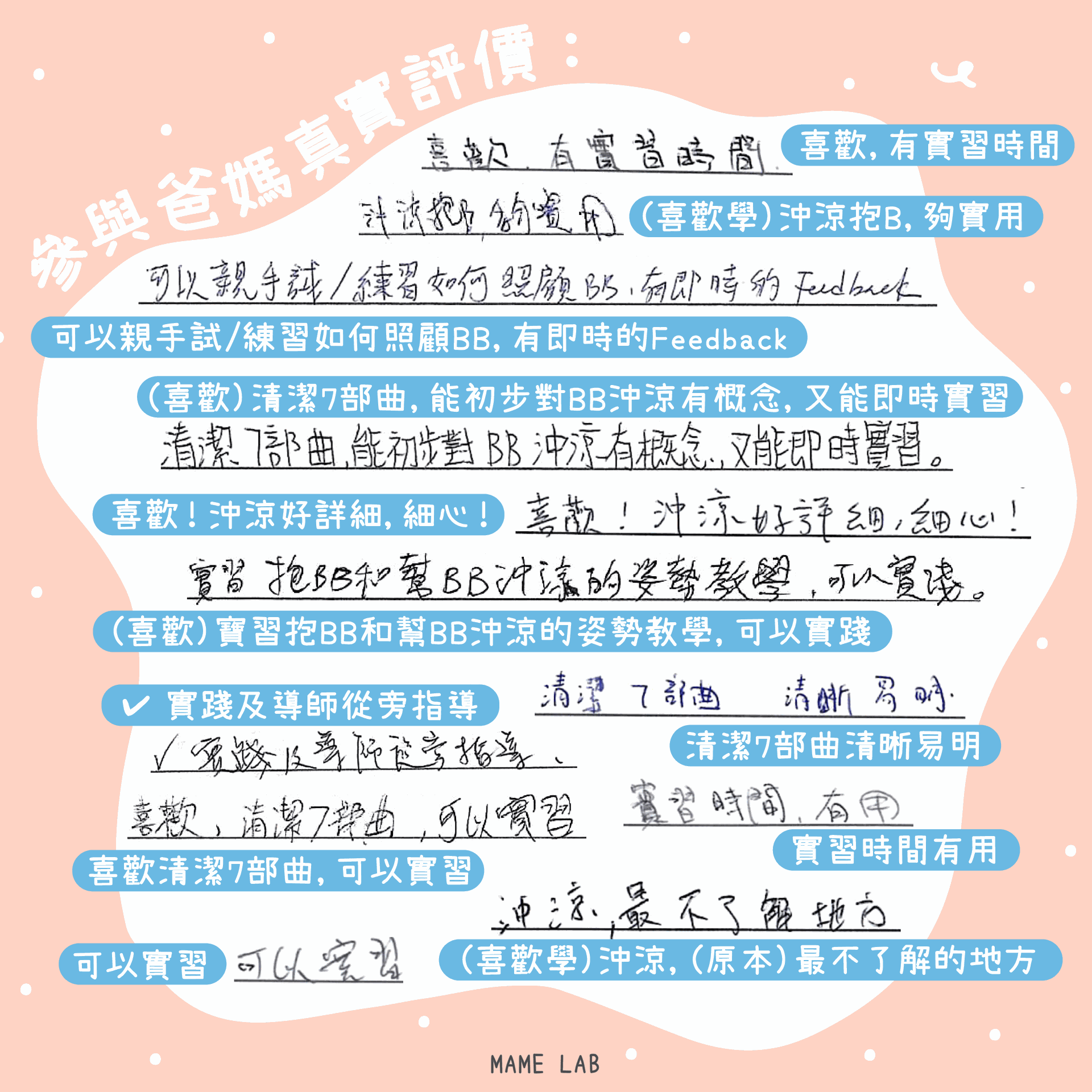老師講解清晰詳細, 唔明白的地方有即時解答,可以知道自己做得啱唔啱。最鍾意學習幫BB沖涼,因為本身好驚,但而家上完堂就有信心!