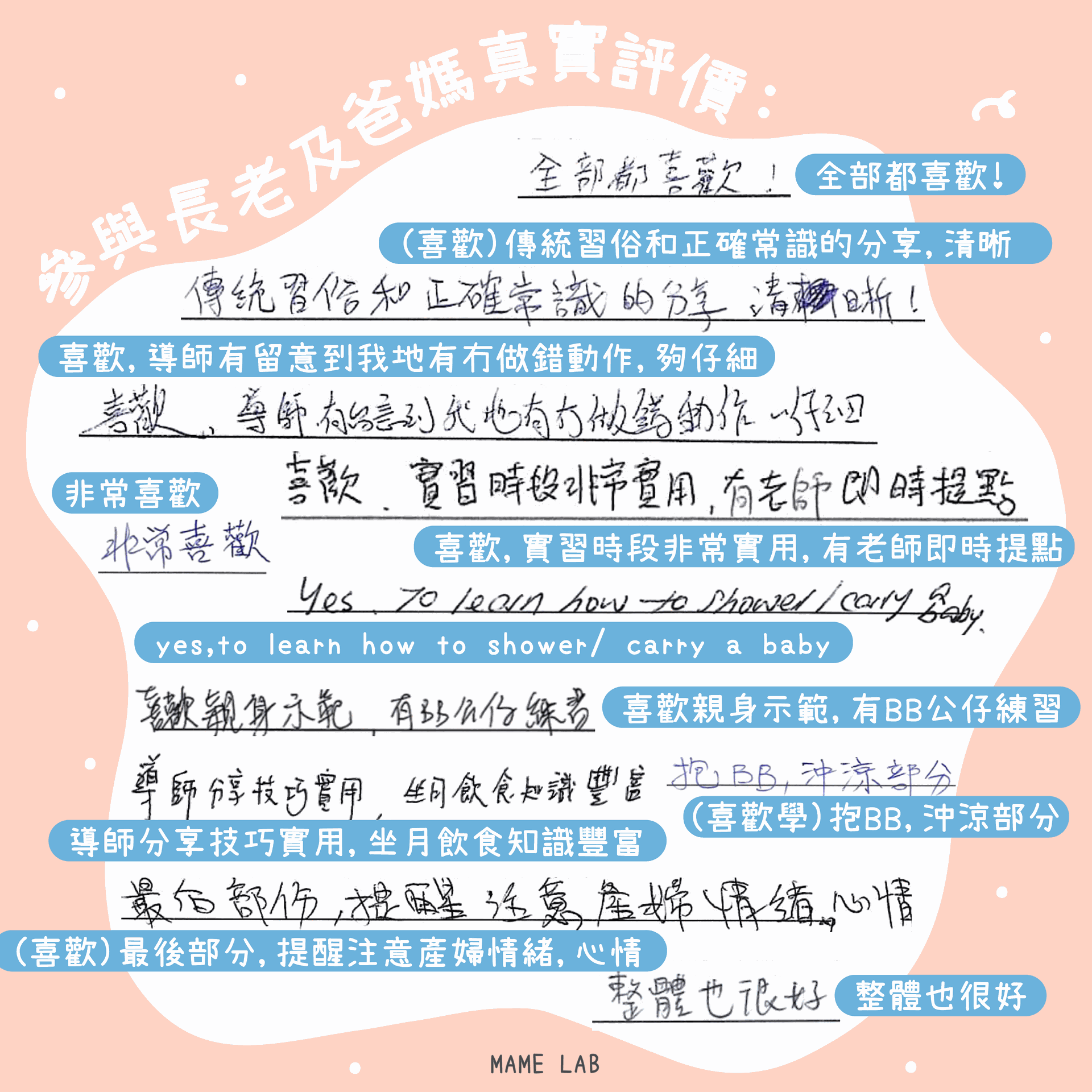 整體都很好,喜歡學幫BB沖涼及換片,老師手法專業,講解詳細有互動,對日後湊孫更有概念!
