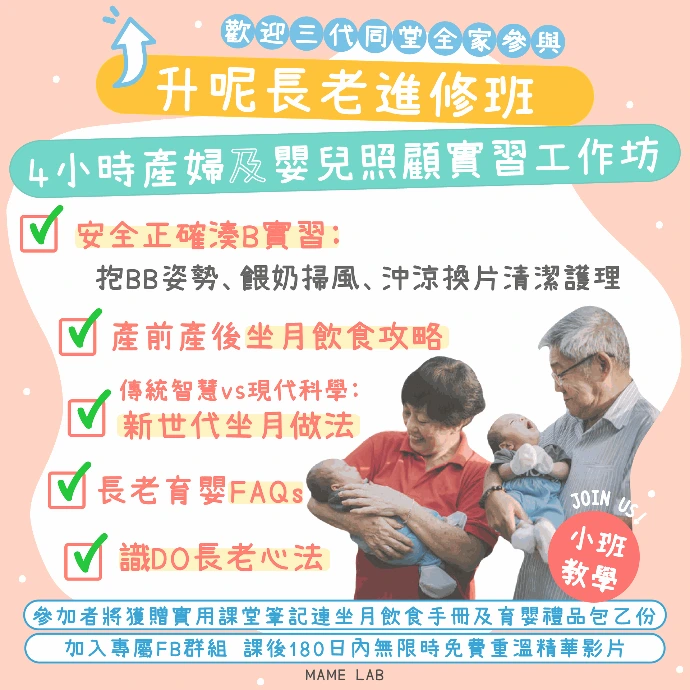 皇牌育嬰課堂專為準新手爸媽而設,如另一半未能抽空出席課堂,歡迎其他照顧者(如長老或親友)陪同出席。