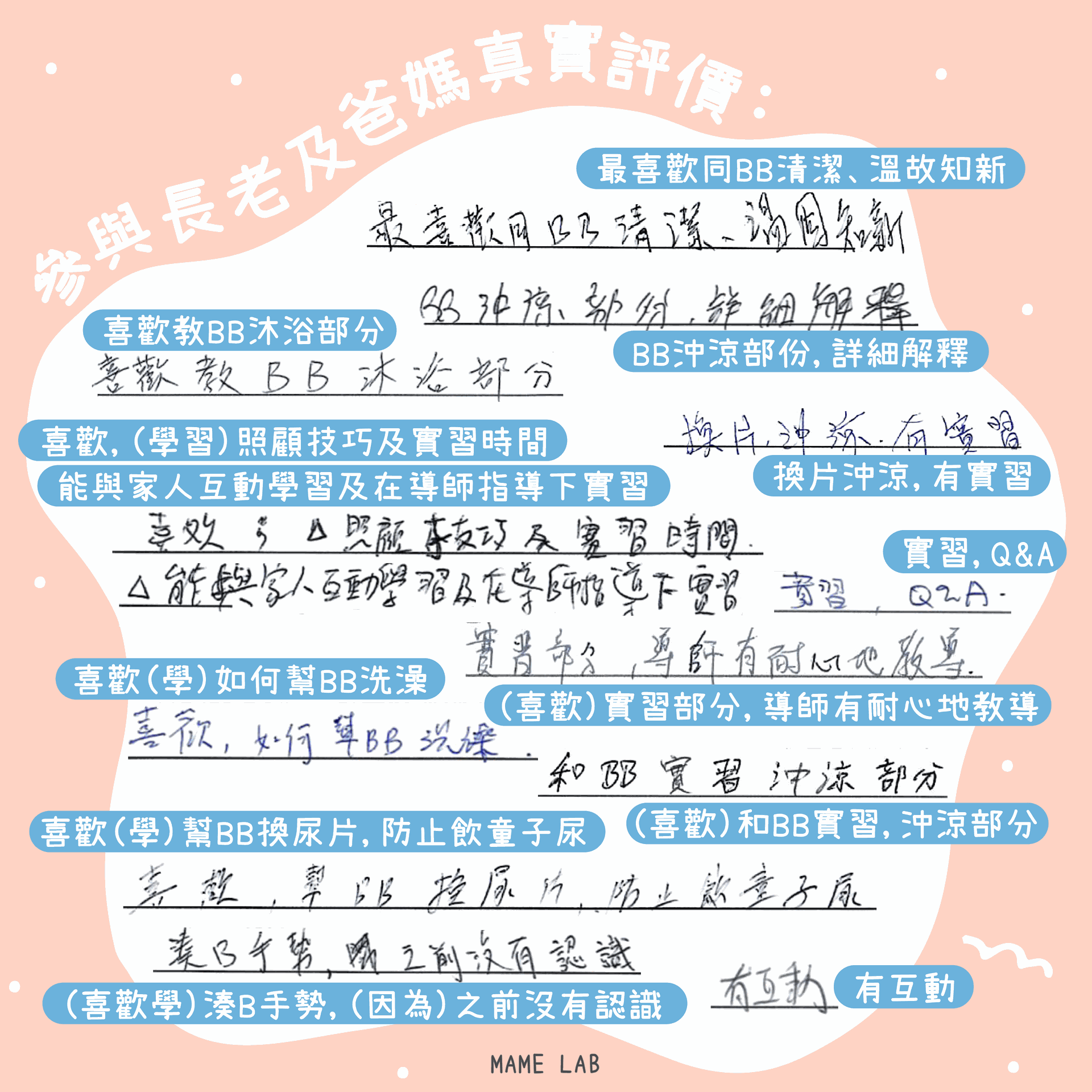 整體都很好,喜歡學幫BB沖涼及換片,老師手法專業,講解詳細有互動,對日後湊孫更有概念!